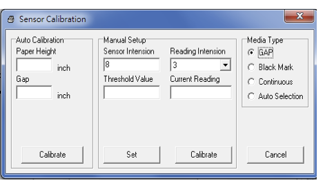 5) Калибровка завершена. Отображается измеренное значение интенсивности излучения датчика для этикеток с предпечатью и "пороговое значение" (theshold value) между прозрачностью пустой подложки и подложки с этикеткой.
